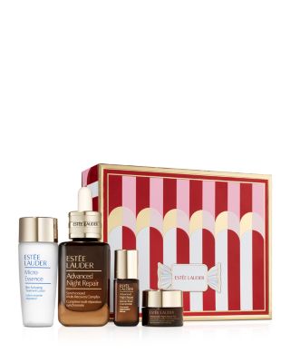 What It Is: A great gift set including a full-size Advanced Night Repair Serum-Estee Lauder's revolutionary serum for radiant, younger-looking skin. This daily regimen helps reduce the look of lines and wrinkles. Give your skin a treat! Discover these high-performance formulas to significantly reduce the look of lines and wrinkles and reignite your radiance. Includes Estee Lauder's revolutionary Advanced Night Repair Serum next-generation serum for radiant, younger-looking skin. Set Includes: - Advanced Night Repair Synchronized Multi-Recovery Complex, full-size 1.7 oz. - Advanced Night Repair Intense Reset Concentrate, deluxe travel size 0.17 oz. - Advanced Night Repair Eye Supercharged Complex Synchronized Recovery, deluxe travel size 0.17 oz. - Micro Essence Skin Activating Treatment Lotion, deluxe travel size 1 oz. What It Does: Skincare essentials to reduce the look of lines and wrinkles. How To Use It: - Apply Micro Essence Am and Pm on clean skin before your repair serum. - Apply Advanced Night Repair Am and Pm before your moisturizer. - Apply Intense Reset Concentrate after your repair serum to help skin recover from visible irritation. - Apply Advanced Night Repair Eye Supercharged Complex Am and Pm around eye area.