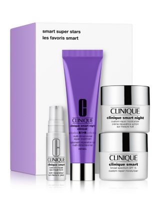 What It Is: A collection of innovative Clinique Smart skin care superstars for advanced anti-aging impact. Set Includes: - Clinique Smart Night Clinical Md Multi-Dimensional Repair Treatment, 1 oz. - Clinique Smart Broad Spectrum Spf 15 Custom-Repair Moisturizer for Dry Combination to Combination Oily Skin, 0.5 oz. - Clinique Smart Night Custom-Repair Moisturizer, 0.5 oz. - Clinique Smart Custom-Repair Eye Treatment, 0.2 oz. What It'S For: All skin types. What It Does: This team of brilliant skincare experts targets the signs of aging. Clinique Smart Night Clinical Md Multi-Dimensional Repair Treatment Retinol is a skin-repairing nighttime treatment that jumpstarts the anti-aging process with the multi-dimensional power of retinol plus comforting hydration. Day and night moisturizers with Clinique Smart hydration technology help skin retain moisture where it's needed most. Clinique Smart Custom-Repair Eye Treatment brings the smart technology to eye-area concerns, including improving the look of crow's feet. Free Of. - Parabens - Phthalates - Fragrances